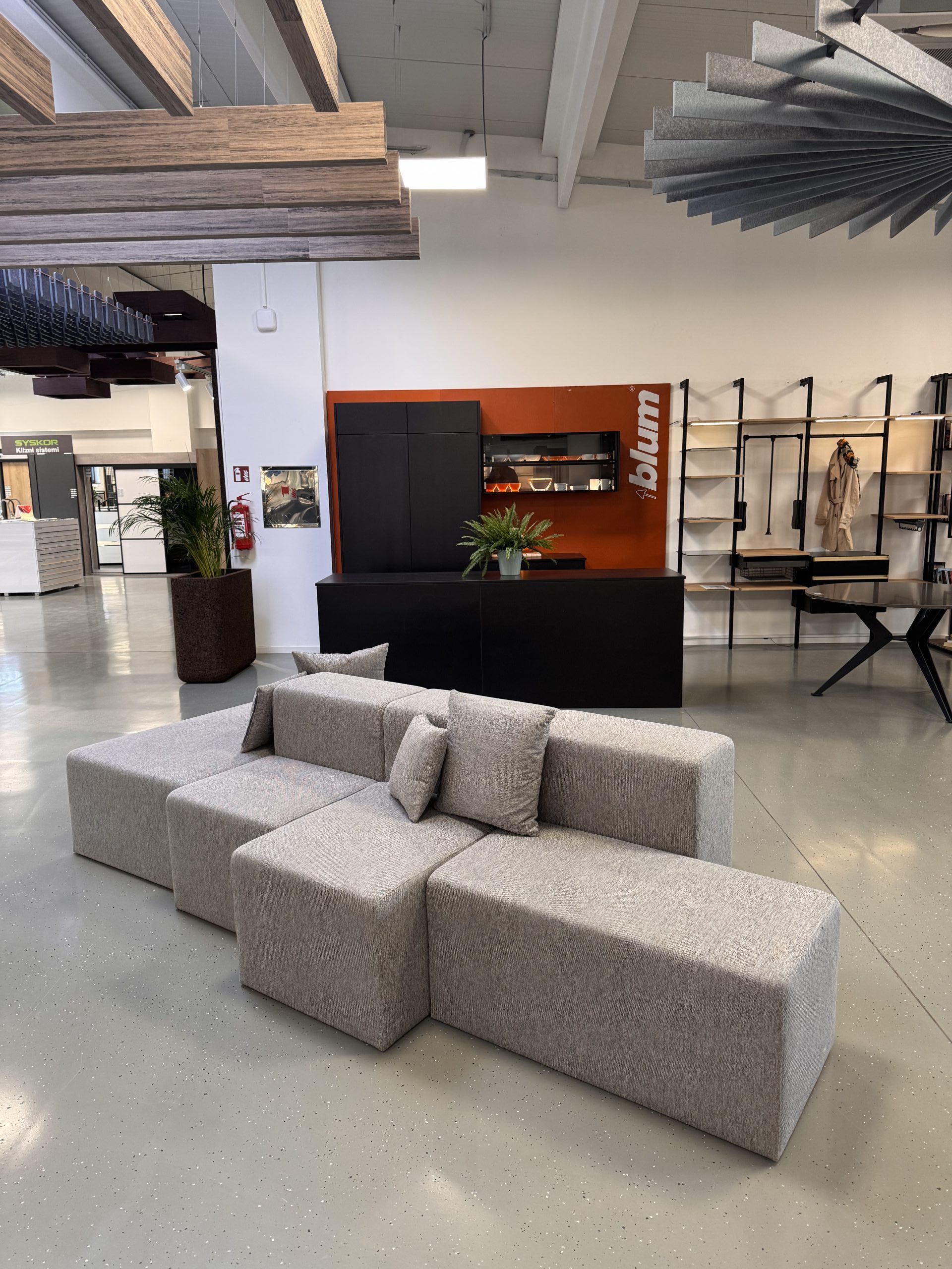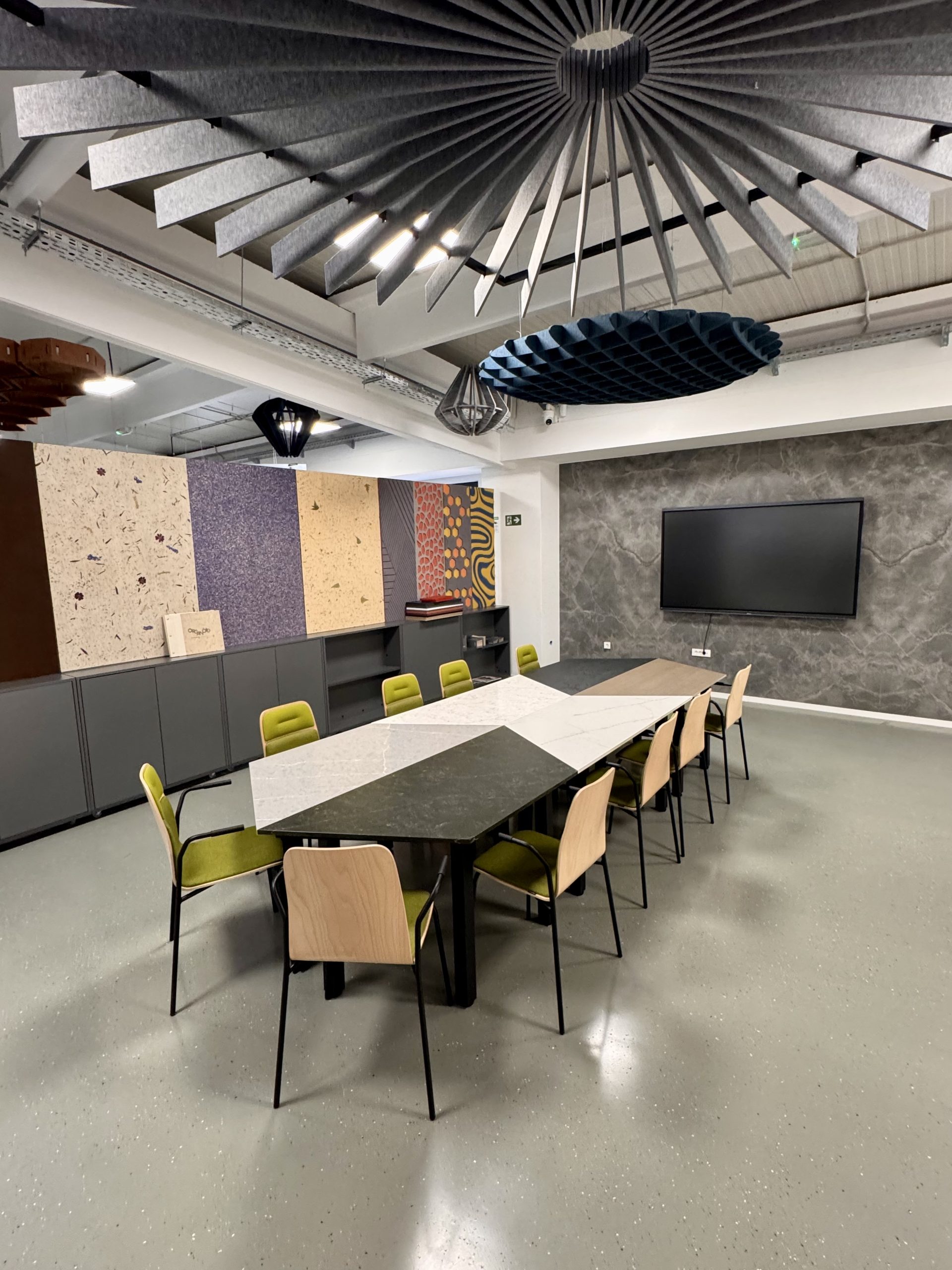 Stol sastavljen od šest trapezoidnih elemenata može se konfigurirati ovisno o potrebama – bilo da se radi o klasičnom sastanku ili prezentaciji s više sudionika. Na zidu iza TV-a nalazi se dekorativna, ali i funkcionalna porculanska ploča koja prostoru daje eleganciju i teksturu.