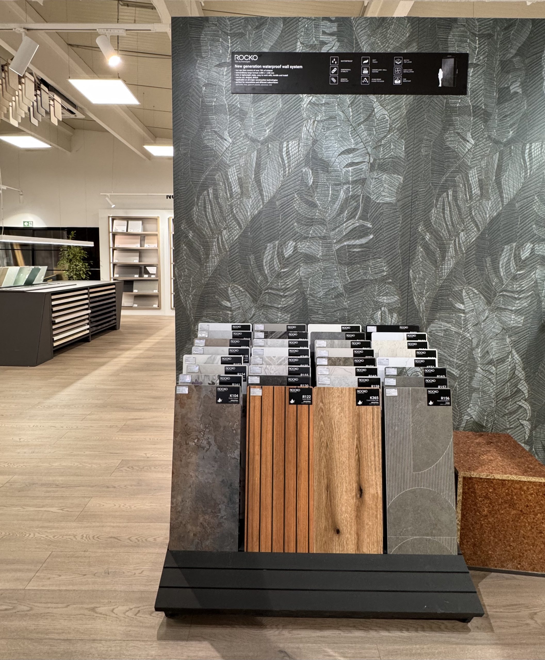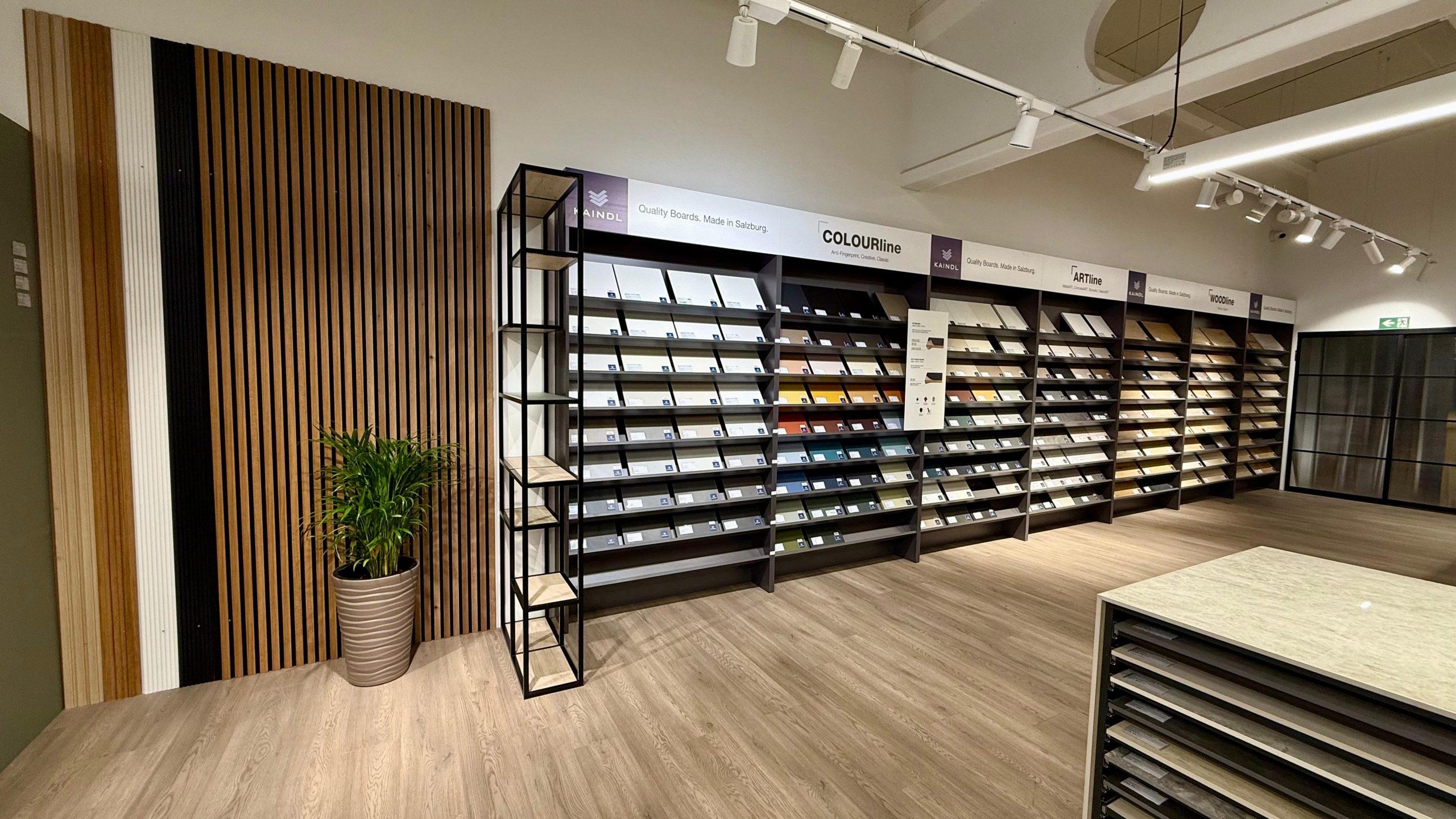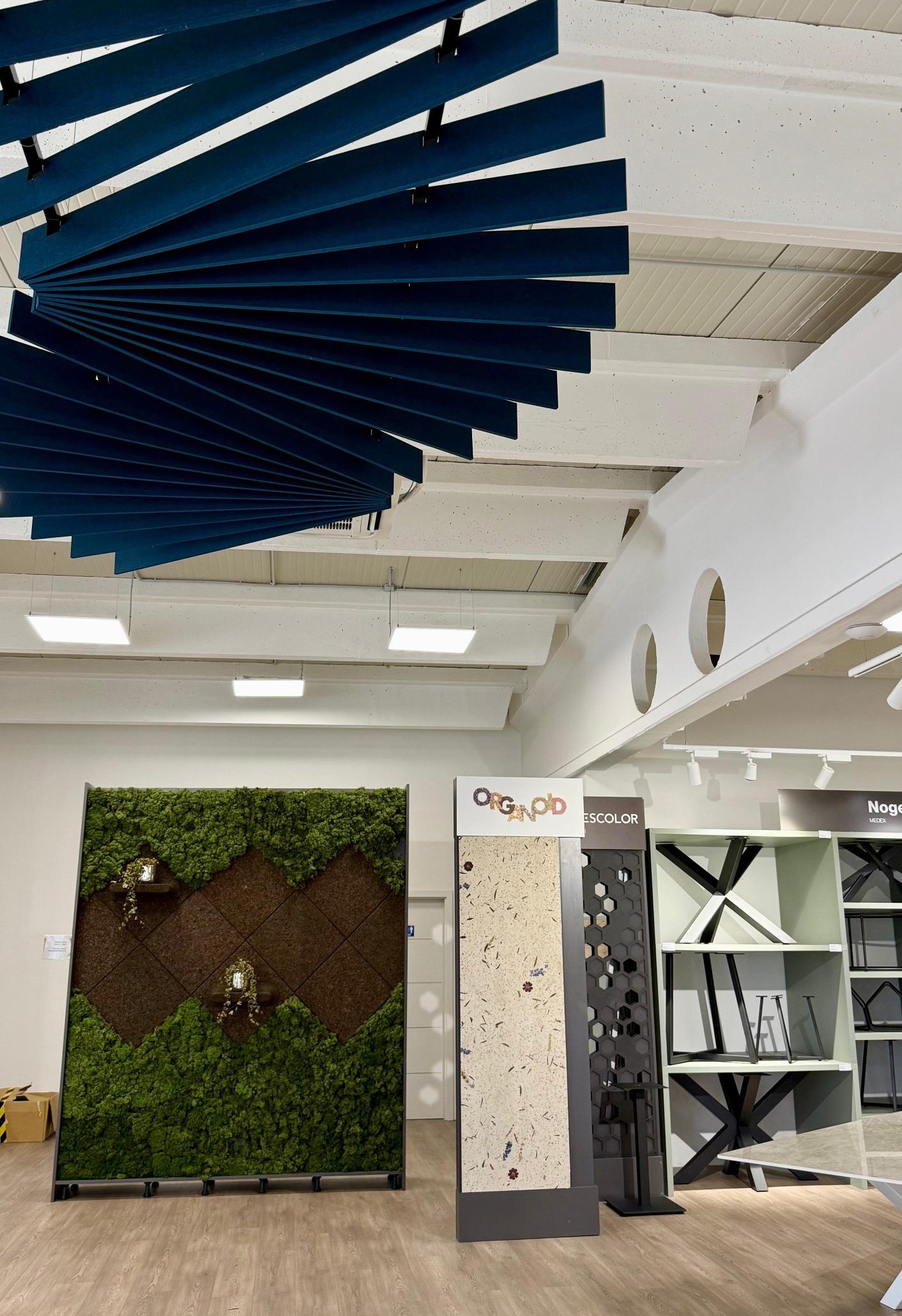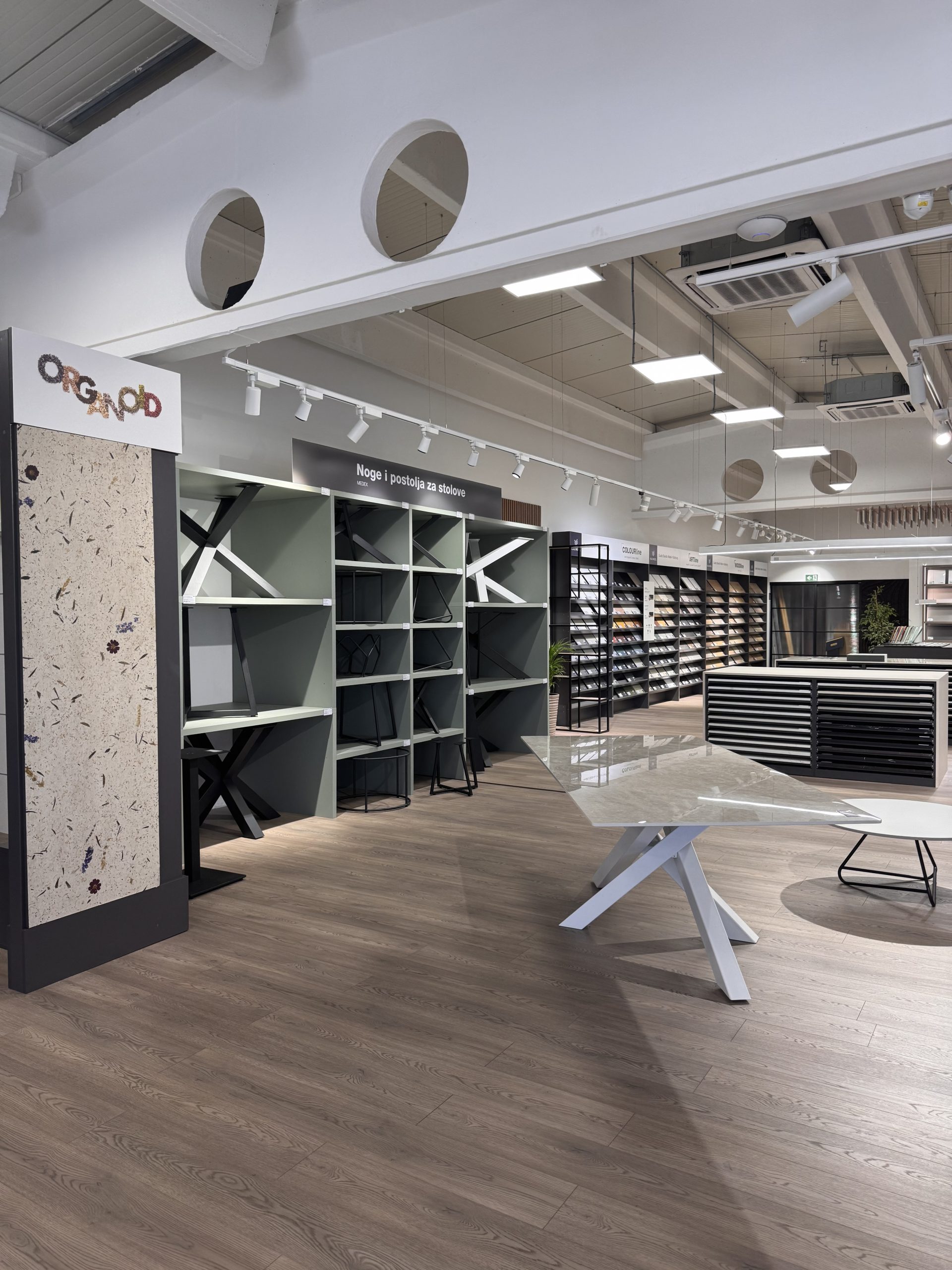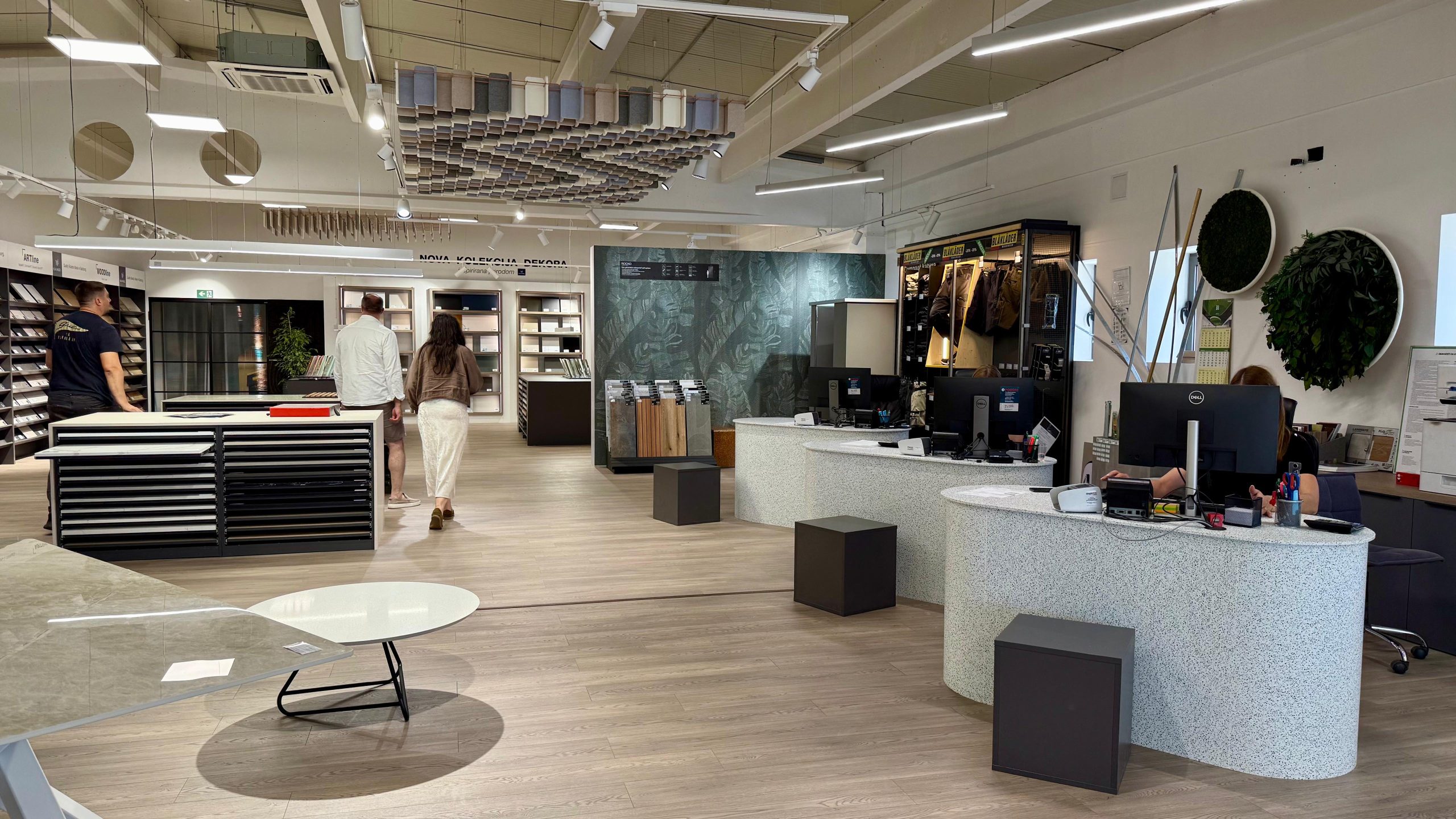 U središtu prostora smjestile su se radne ploče – centralni element koji prirodno okuplja posjetitelje i vodi ih kroz ponudu dekora raspoređenih oko njih. Pogled prema gore otkriva akustičnu izolaciju na stropu, složenu u dinamičan uzorak valova koji prostoru daje ritam i energiju.