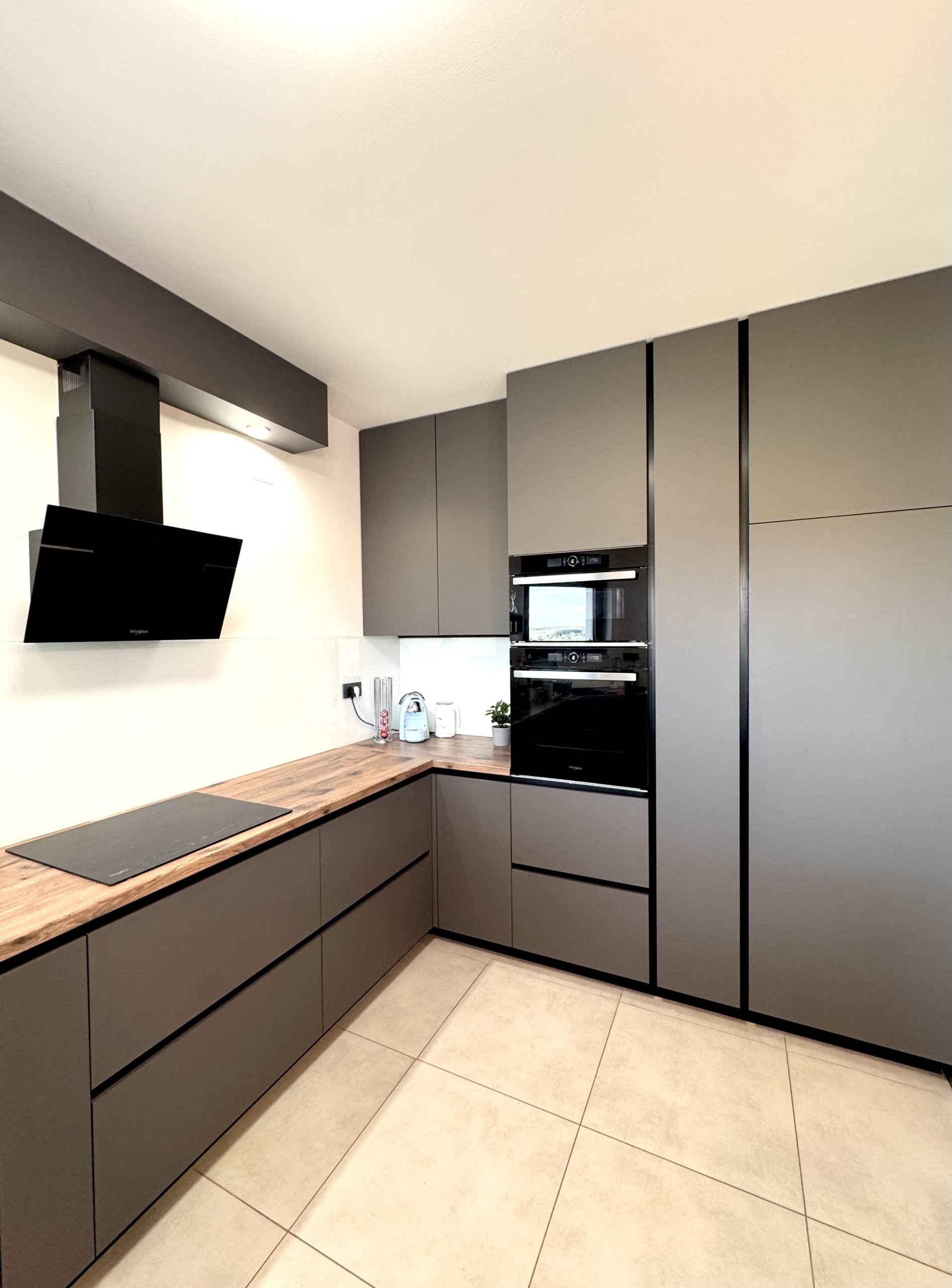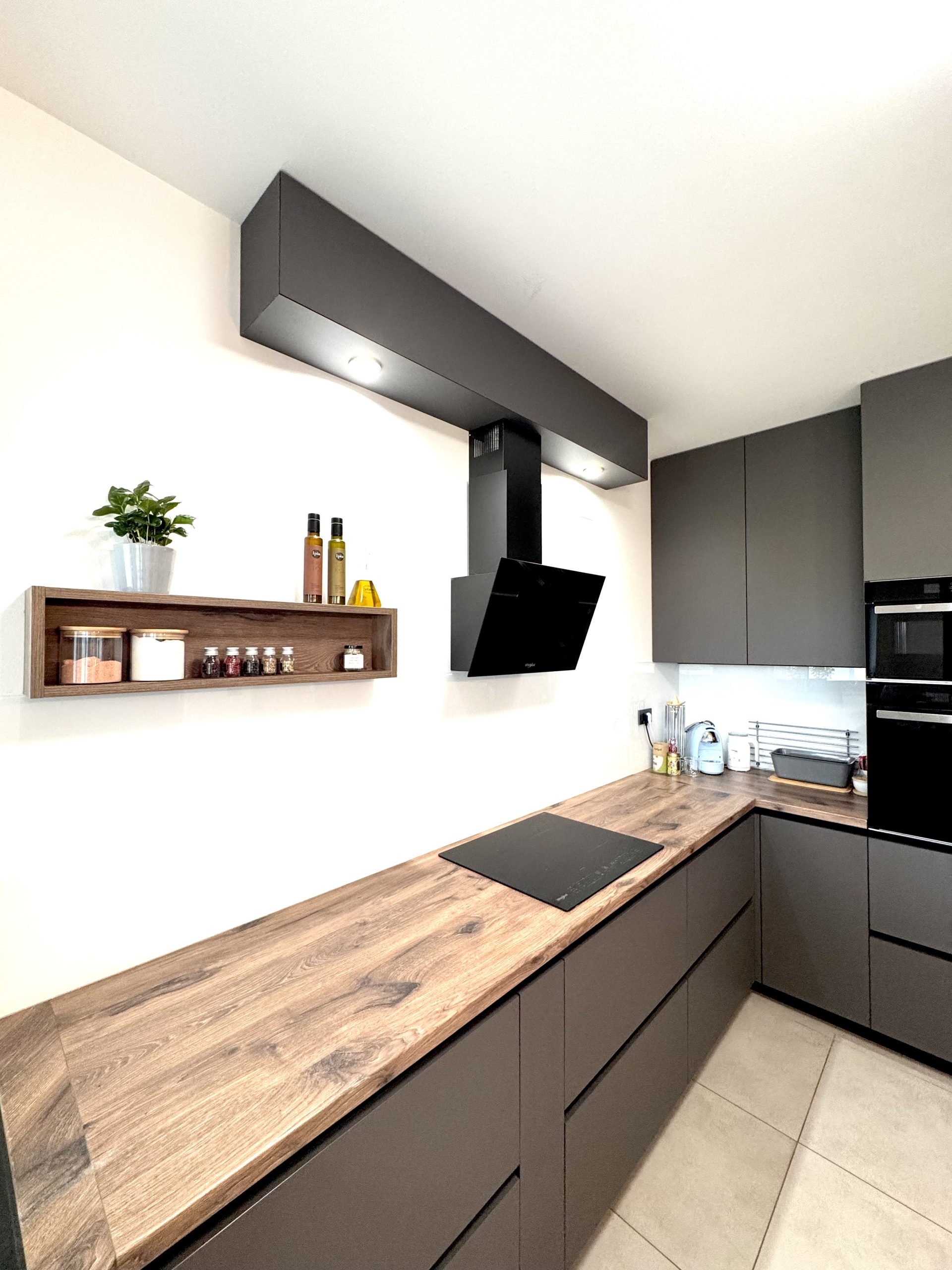 PROJEKTNI ZADATAK: Dizajnirati kuhinju po mjeri koja objedinjuje modernu estetiku i funkcionalnost, uz naglasak na tamne tonove, prirodne materijale i detalje industrijskog karaktera. Ključno je bilo integrirati sve potrebne aparate, osigurati dovoljno radne površine te uključiti coffee station kao omiljeni dnevni ritual vlasnika.