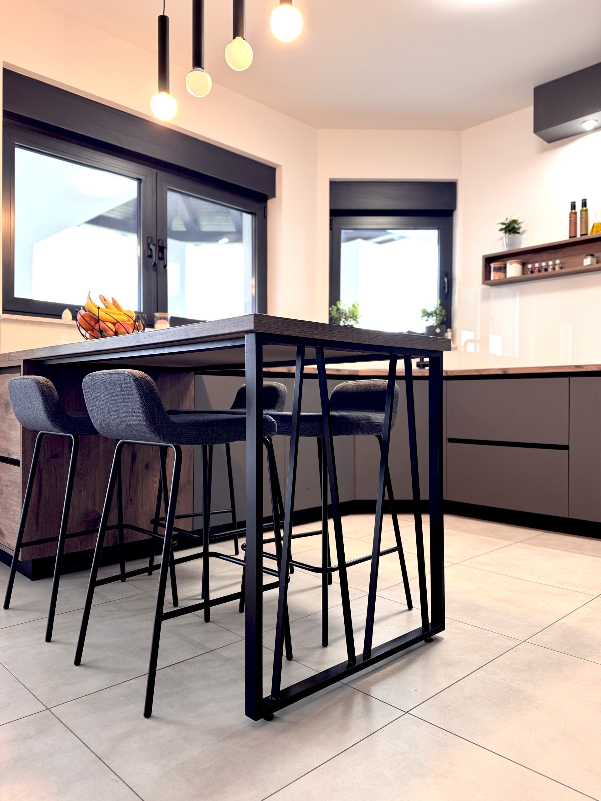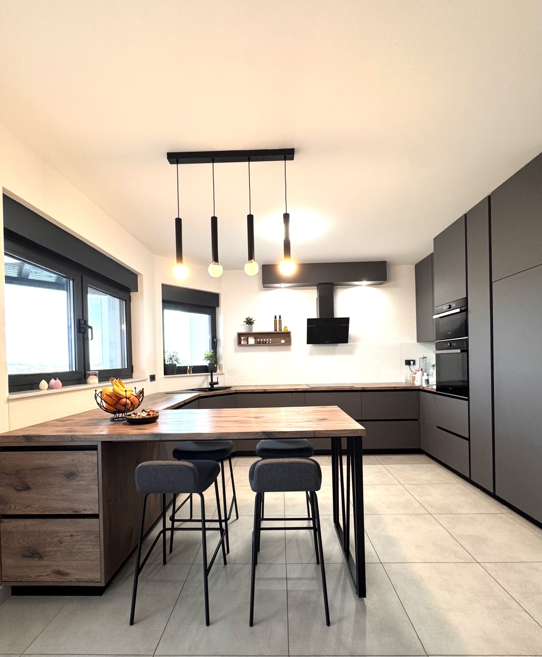 Za projekt EK osmislili smo kuhinju koja spaja suvremeni dizajn s toplim industrijskim štihom. Kombinacija antracit sive, toplih tonova drva i hladnog, samouvjerenog crnog metala stvara prostor koji je funkcionalan, ali i snažno vizualan – kuhinja koja ne traži pažnju, ali je automatski dobiva.