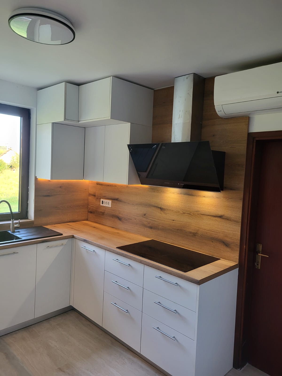 Umjesto klasičnih kuhinjskih zidnih pločica, odabrali smo drvo istog uzorka kao i radna ploča, čime smo postigli skladan, monokromatski izgled i dodatno naglasili toplinu materijala. Ova odluka prostoru daje suvremen, ali topao karakter – ništa ne strši, a opet sve ima svoj identitet.