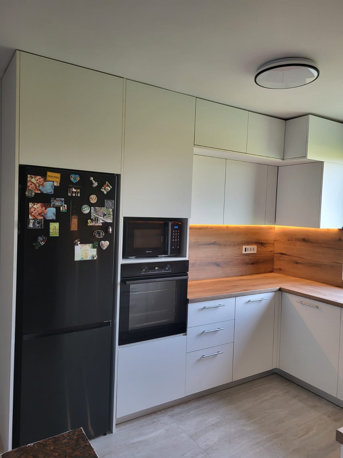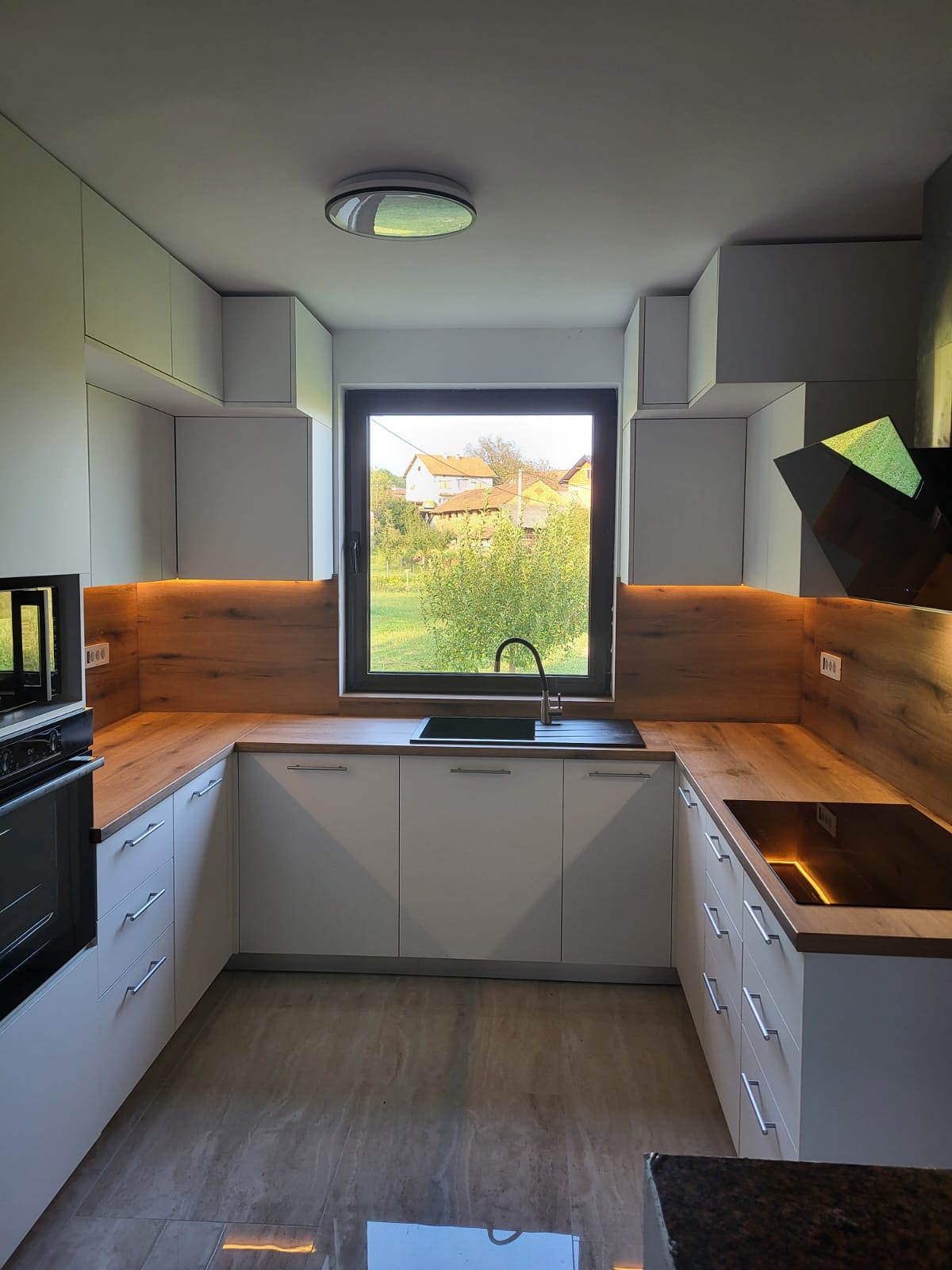 Ponekad je manje zaista više – i ova kuhinja to savršeno dokazuje. U središtu dizajna stoji bezvremenska kombinacija bijelih kuhinjskih elemenata i tople drvene radne ploče, koja prostoru daje svježinu i prirodnu eleganciju.